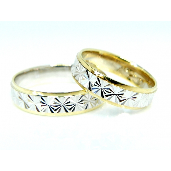 Snubní prsteny vyrobené z bílo-žlutého 14kt zlata, zdobené hlubokým ozdobným rytím. Lze vyrobit i v červeno-bílé kombinaci