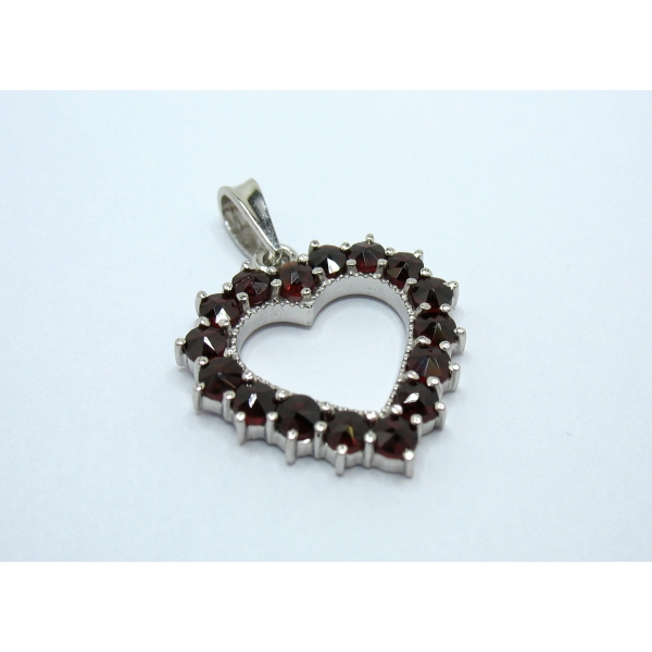 Přívěšek srdce je zdobený pravými českými granáty.Rhodiované stříbro.