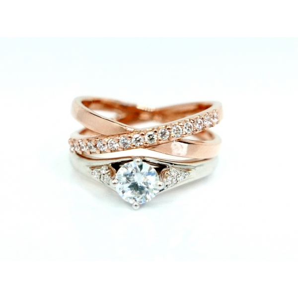Dámský snubní prsten velmi speciální tvar ,který se krásně hodí k výrazným zásnubním prstenům. Prsten vyrobený ze 14kt červeného zlata , posázený zirkony/brilianty/moissanity v ceně 17400,- . Pánský prsten lze doladit podle vašeho výběru