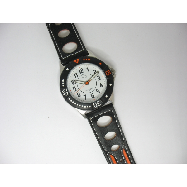 Dětské hodinky s černým páskem a oranžovými detaily.Vodotěsné 50 M.