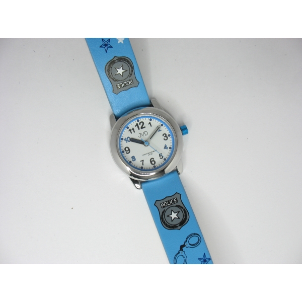 Dětské hodinky v modré barvě,pásek zdobí policejní motivy. Vodotěsné 50 m.