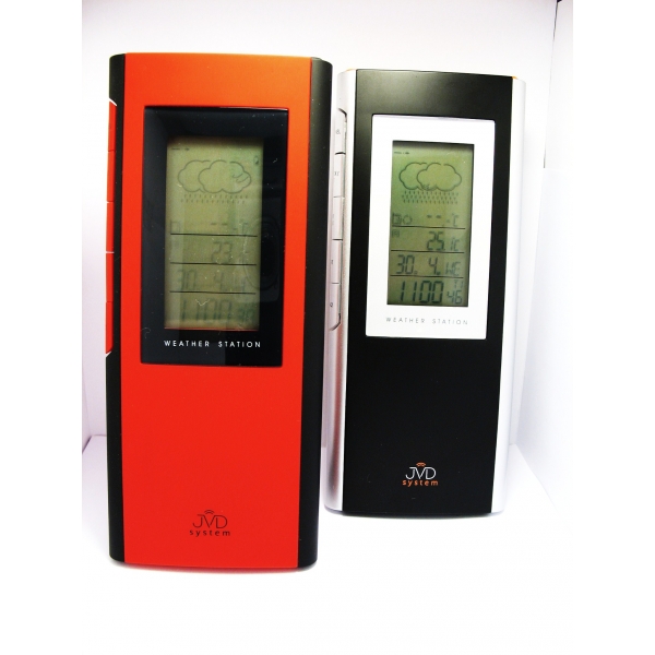 Obrázkový barometr značky JVD. Budík, čas řízený radiosignálem, bezdrátové čidlo.