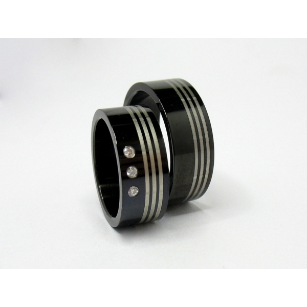 Ocelové snubní prsteny v černém provedení, dámský se třemi zirkony. Možnost objednání s brilianty