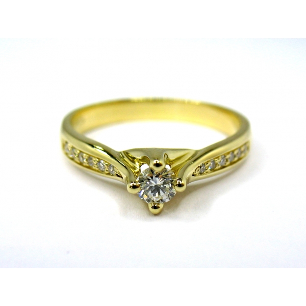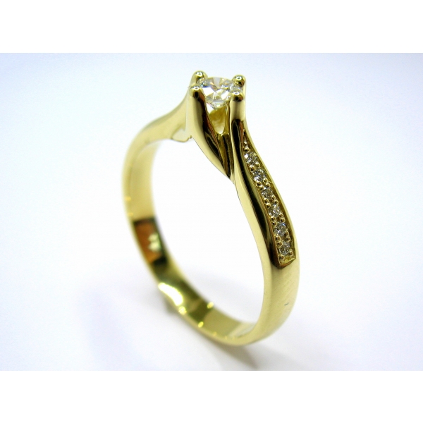 Luxusní zásnubní prsten vyrobený ze 14k zlata posázený brilianty. Středový brilianty usazený v luxusní korunce