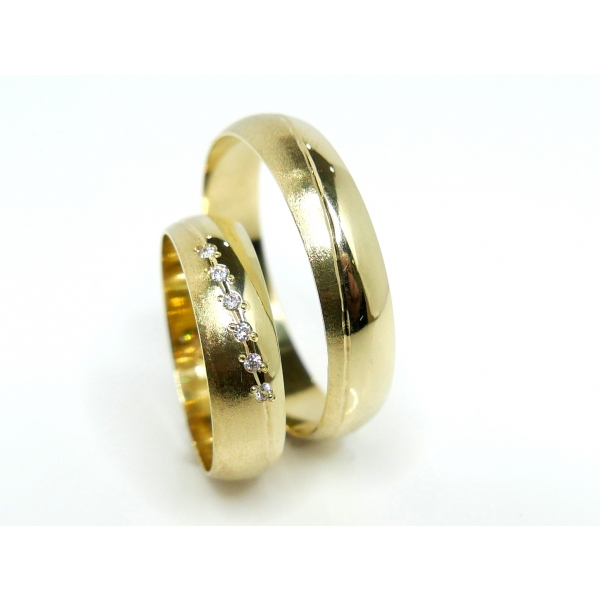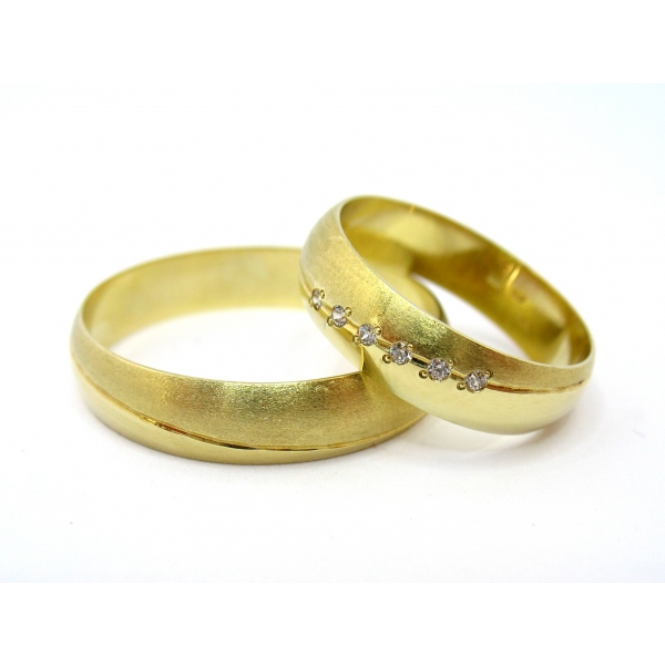 Snubní prsteny vyrobené ze 14 k zlata . Prsteny zdobené matováním, dámský posázený zirkony/brilianty/moissanity 17300,-