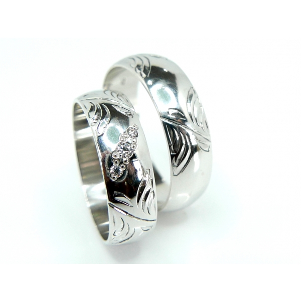 Snubní prsteny vyrobené ze 14 k zlata, zdobené ručním rytím, dámský prsten se zirkony/brilianty. Cena s moissanity 18700,-