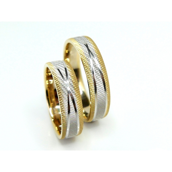 Snubní prsteny vyrobené ze 14kt zlata , kombinace bílé a žluté zlato s rytím .