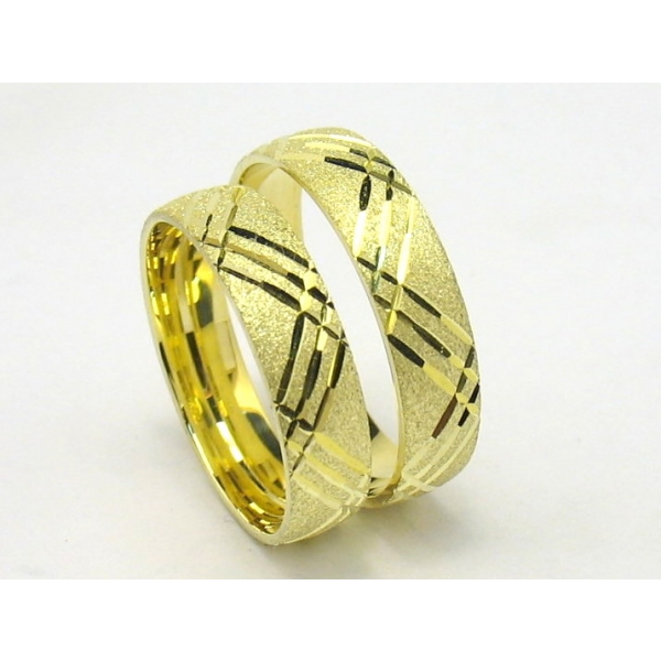 Mimořádná cena-doprodej. Žluté zlato s velmi efektním matováním a rytím v lesku. Šíře 5mm. Pouze v rozměrech 55 a 60.