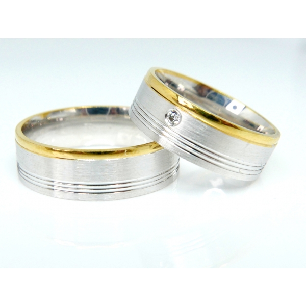Snubní prsteny z bílo-žlutého 14k zlata, zdobené matováním a drážkami. Dámský prsten posázený zirkonem/briliantem/moisanitem 30500,- .