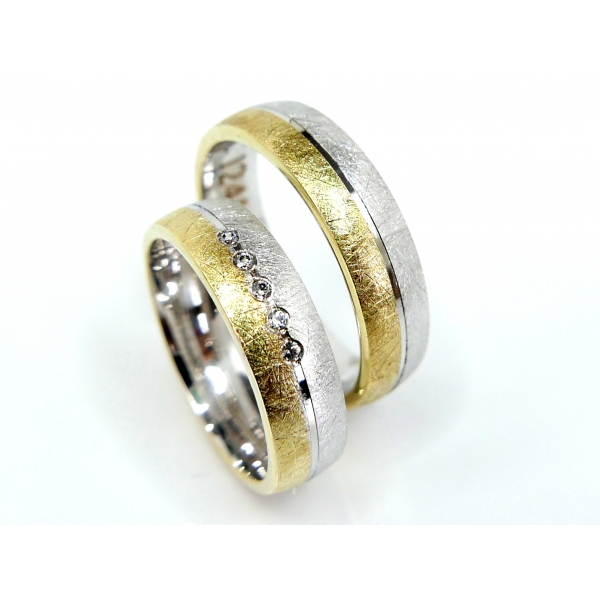 Luxusní snubní prsteny v masivním provedení a jedinečným matováním. Prsteny jsou vyrobené ze 14k zlata s kombinací žlutého zlata. Dámský prsten je posázen zirkony/brilianty Cena s moissanity 34400,-