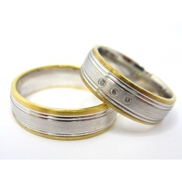 Snubní prsteny vyrobené v kombinaci bílého a žlutého 14kt zlata zdobené matováním. Dámský prsten zdobený zirkony/brilianty/moissanity v ceně 26800,-