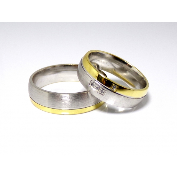 Snubní prsteny v kombinaci s bílým a žlutým zlatem, velmi kvalitní a masivní provedení zajišťuje komfort při nošení. Dámský prsten se zirkony/brilianty