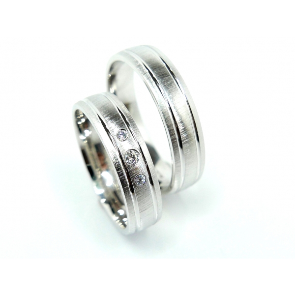 Snubní prsteny vyrobené z 14k bílého zlata. Prsteny s matováním a drážkami, dámský prsten se zirkony/brilianty/moissanity v ceně za pár 21900,-