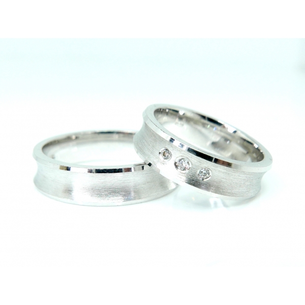 Netradiční venkovní prohnutí a vnitřní půlkulatý profil vytváří opravdu zajímavý efekt.Kamínky-zirkony v dámském prstýnku oživí elegantní matování. Tyto prsteny lze objednat s brilianty. Cena s moissanity 28100,-