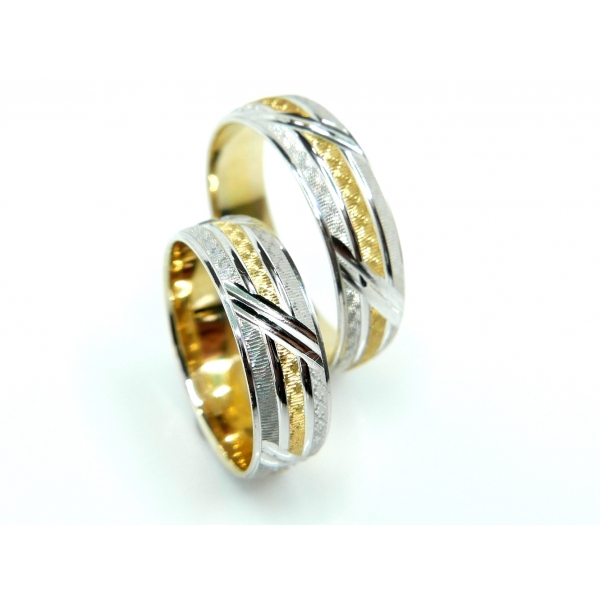 Snubní prsteny vyrobeny v kombinaci bílého a žlutého 14kt zlata zdobené matováním a drážkami