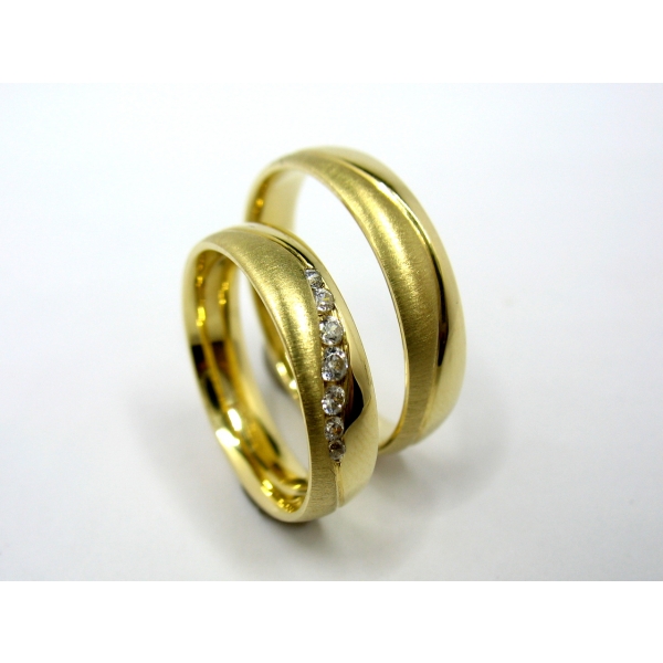Snubní prsteny vyrobeny ze zlata. Prsteny s drážkou a matováním, dámský posázen zirkony/brilianty. Cena s moissanity 28900,-