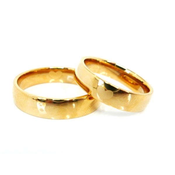 Snubní prsteny vyrobené z chirurgické oceli zlacené 14kt zlatem, dámský prsten zdobený zirkonem. Na dámském i pánském prstenu je jemné zdobení matováním a to srdíčko, na pánském vevnitř na dámském zvenku.