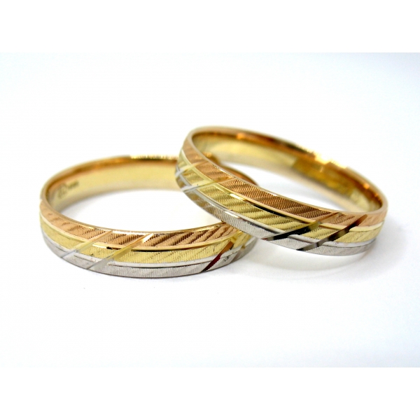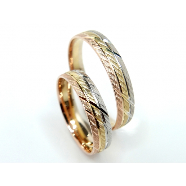 Něžné, tříbarevné provedení snubních prstýnků s velmi efektními drážkami. Červené (růžové), bílé a žluté zlato.