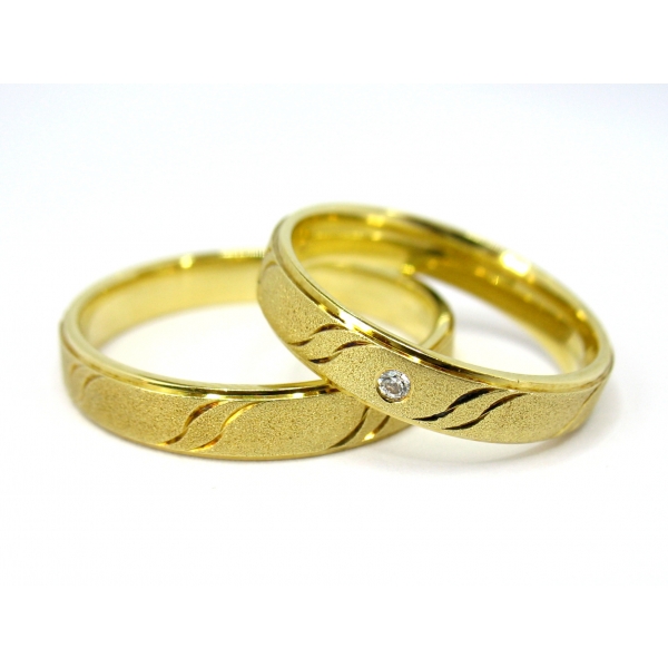 Snubní prsteny vyrobené ze 14 k zlata, prsteny zdobené rytím a matováním. Dámský prsten zdobený zirkonem/briliantem/moissanitem v ceně 16900,-