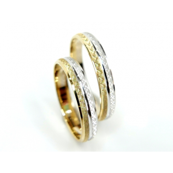 Snubní prsteny v kombinaci bílého a žlutého 14kt zlata zdobené výrazným broušením