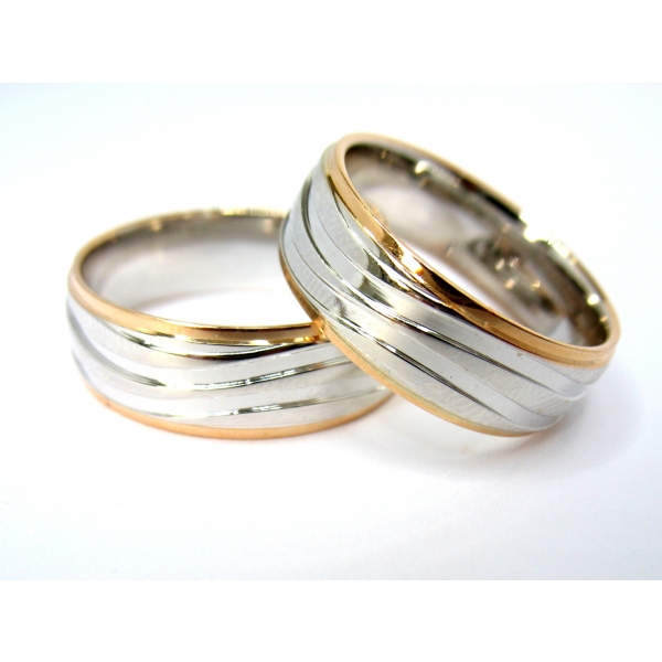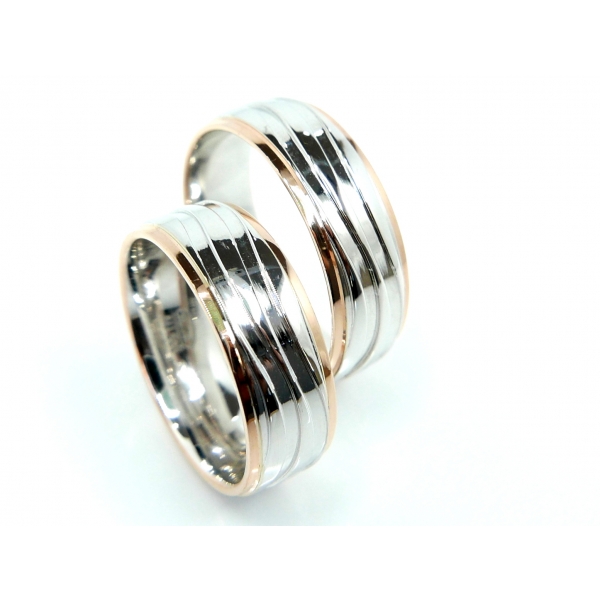 Snubní prsteny vyrobené ze 14 k zlata, červené (růžové) zlato v kombinaci s bílým zlatem, hloubení a šířka 6mm zajišťují prstenům luxus