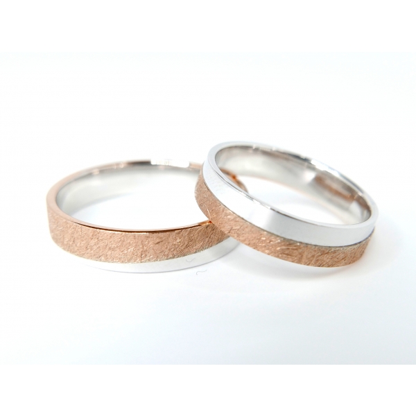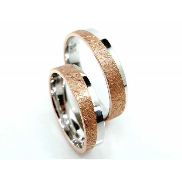 Bílo červené (růžové) snubní prsteny z 14kt zlata . Zdobený matováním.