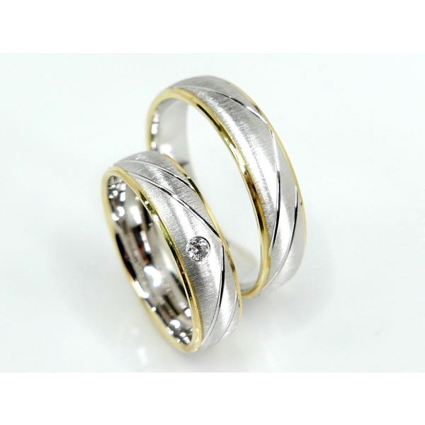 Snubní prsteny vyrobené z bílého a žlutého zlata. Dámský prsten zdobený zirkonem/briliantem/moissanitem v ceně 21430,- za pár