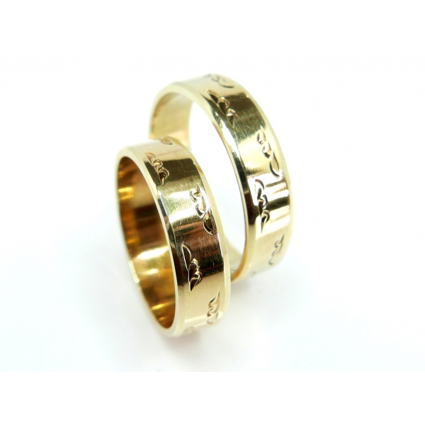 Snubní prsteny vyrobené ze 14kt zlata zdobené ručním rytím