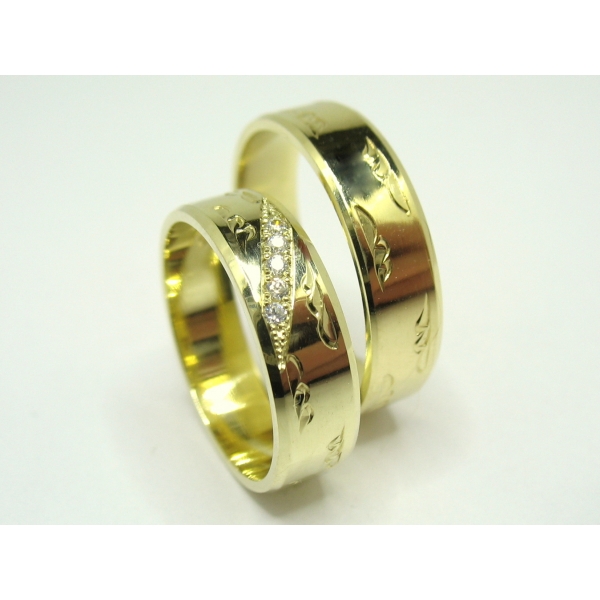 Snubní prsteny vyrobené ze 14 k zlata s ručním rytím. Dámský prsten zdobí zirkony/brilianty