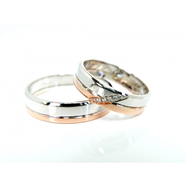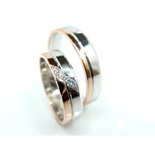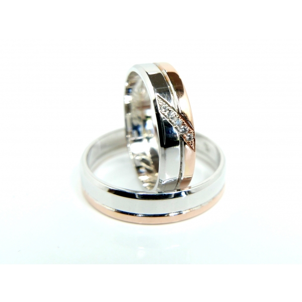 Snubní prsteny v kombinaci bílého a červeného 14kt zlata v lesklém provedení . Dámský prsten zdobený zirkonem/briliantem/moissanitem v ceně 18500.-
