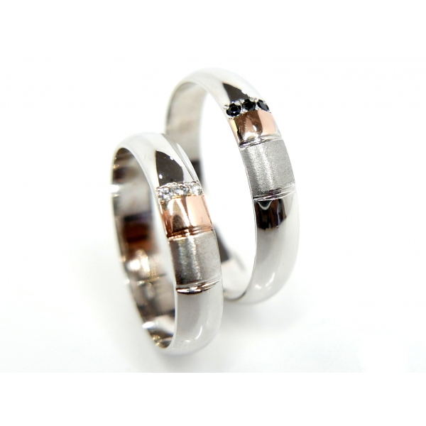 Snubní prsteny vyrobené ze 14 k zlata, kombinované v červené (růžové) barvě zlata. Dámský prsten zdobený zirkony/brilianty/moissanity v ceně 14500,-