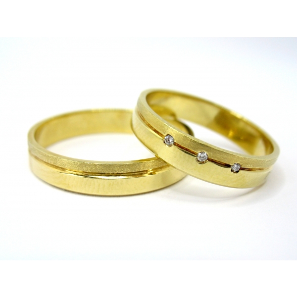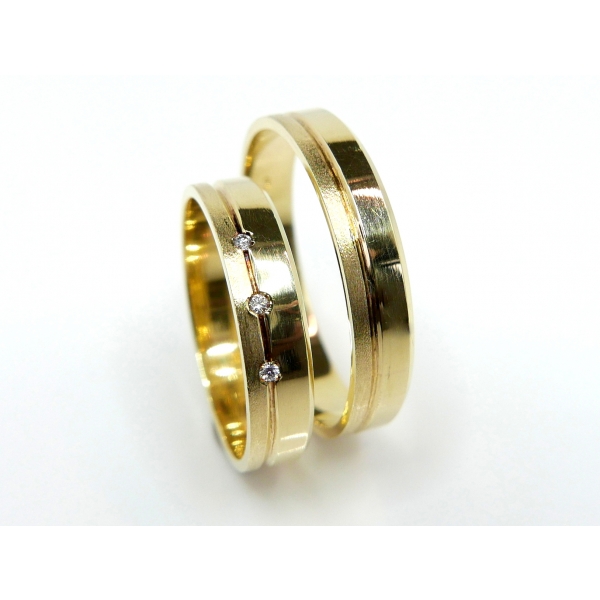 Snubní prsteny vyrobené ze 14 k zlata , prsteny zdobené matováním . Dámský prsten se zirkony/brilianty/moissanity v ceně 14900,-