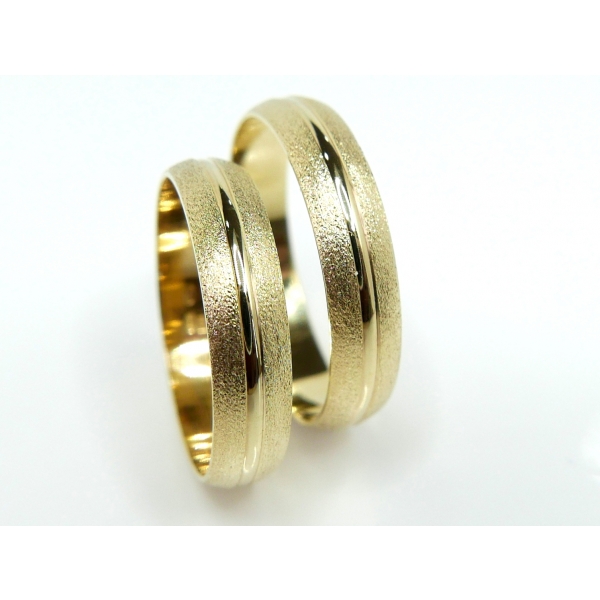 Nadčasový design a velmi kontrastní kombinace hrubého matování a lesklé drážky. Lze dodat i libovolný počet kamínků. Prsteny jsou vyrobené ze 14kt zlata
