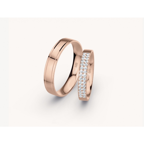 Červené (růžové) zlato s ručně vkládanými kameny.Pánský prsten je širší a decentně zdobený drážkami.