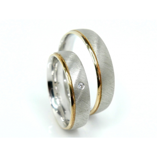 Snubní prsteny z bílého zlata s matováním a v kombinaci s bílým zlatem, dámský prsten se zirkonem/briliantem. Cena páru s moissanity 22000,-