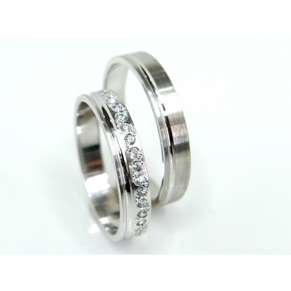 Snubní prsteny vyrobené ze zlata s matováním a dámský se zirkony. Cena páru s moissanity 16800,-