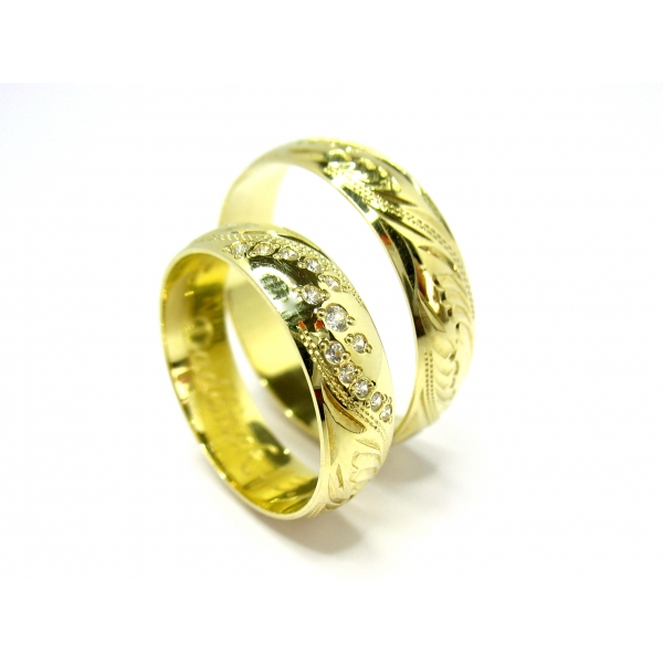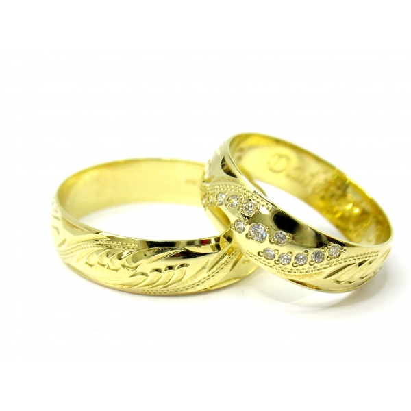 Snubní prsteny s hlubokým ručním rytím vyrobené ze 14kt zlata . Dámský prsten se zirkony/brilianty/moissanity 21830,-