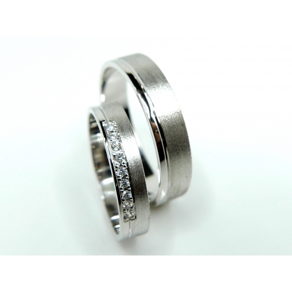 Snubní prsteny vyrobené ze stříbra .Prsteny zdobené matováním, dámský prsten posázen zirkony/brilianty