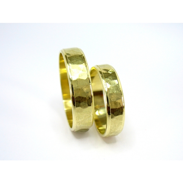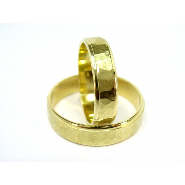 Snubní prsteny vyrobené ze 14kt zlata, prsteny jsou po celém obvodu tepané s lesklými hranami