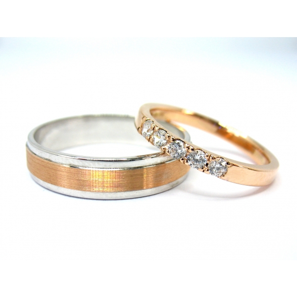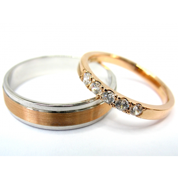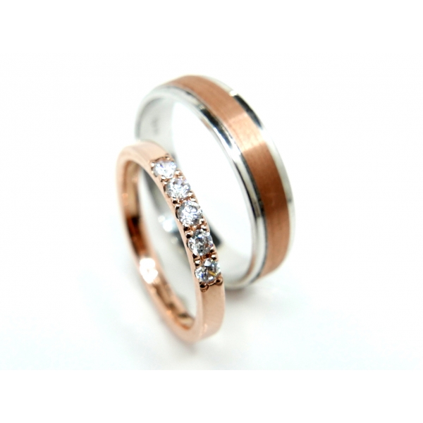Snubní prsteny vyrobené ze 14 kt zlata, červené (růžové) barvy, pánský prsten v kombinaci s bílým zlatem. Dámský prsten posázený zirkony. Prsteny lze vyrobit v libovolné kombinaci barev a také s brilianty/moissanity v ceně 22900,-