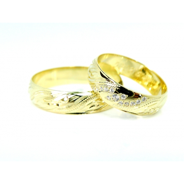 Snubní prsteny vyrobené ze 14kt zlata . Prsteny jsou zdobené hlubokým ručním rytím , dámský prsten posázený zirkony/brilianty/moissanity v ceně 20900,-