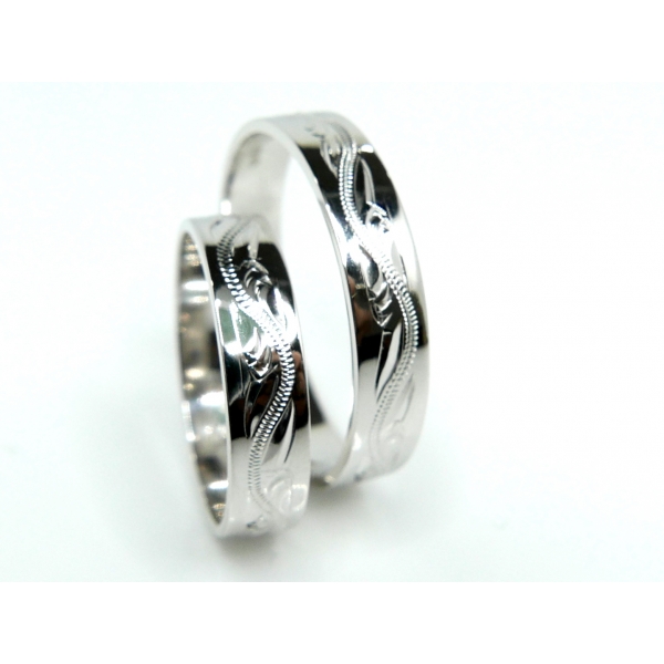 Snubní prsteny z bílého 14kt zlata s ručním rytím.