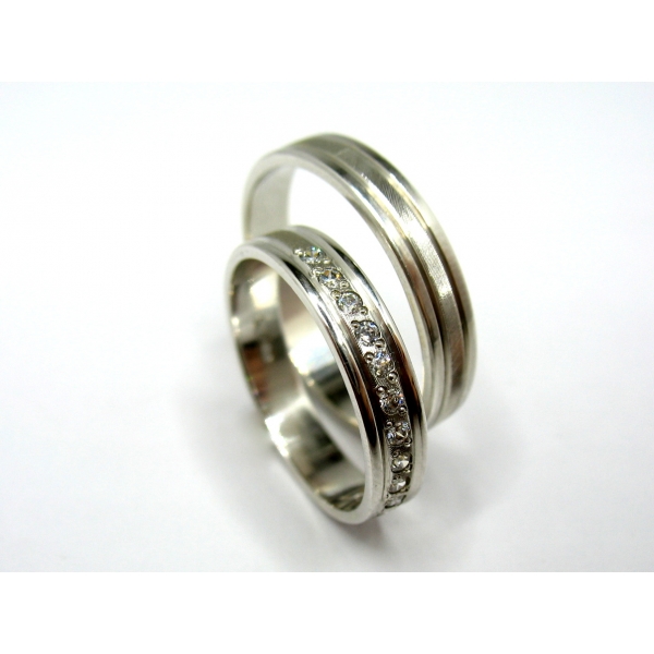 Nadčasové prsteny vyrobené ze stříbra, pánský prsten s drážkami, dámský posázený zirkony. Lze vyrobit v bílém i ve žlutém zlatě