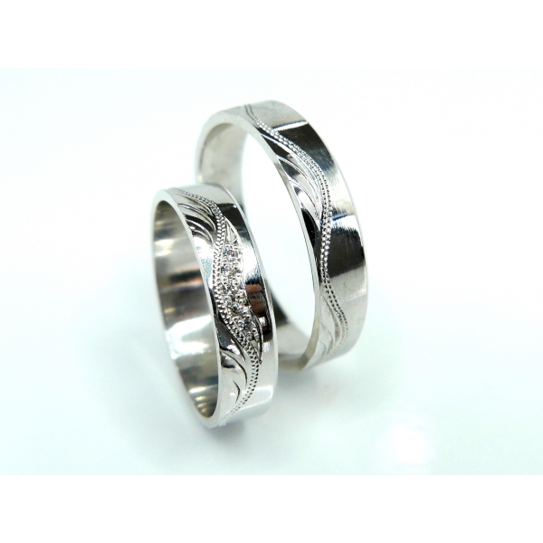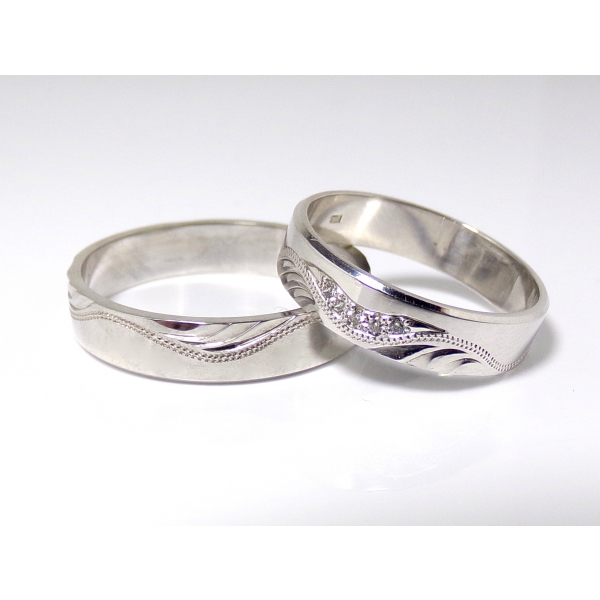 Snubní prsteny vyrobené ze 14 k zlata, zdobené ručním rytím, dámský prsten se zirkony/brilianty. Cena s moissanity 15650,-