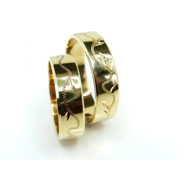 Snubní prsteny vyrobené ze 14kt zlata zdobené ručním rytím