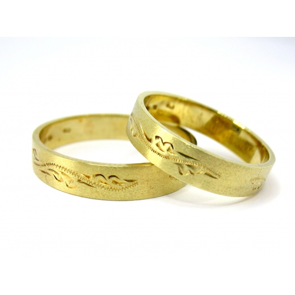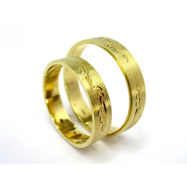 Snubní prsteny vyrobené ze 14 k zlata , zdobené rytím a matováním