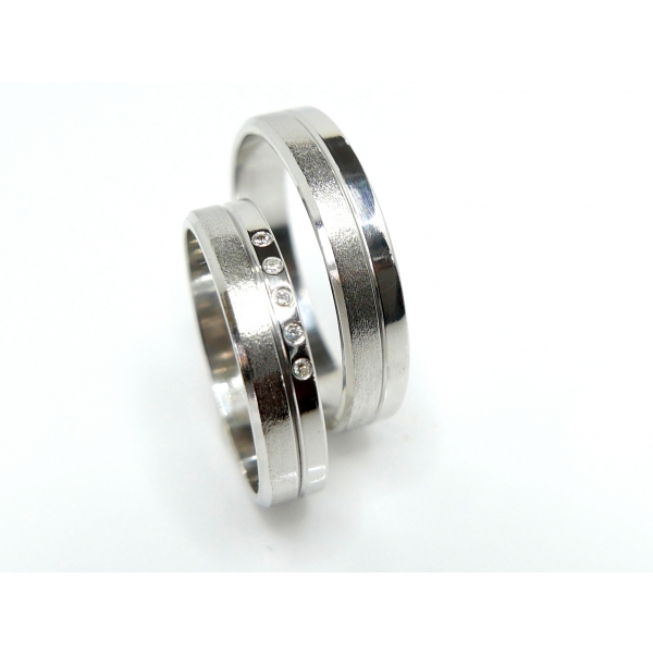 Snubní prsteny ze stříbra s drážkou a matováním. Dámský prsten se zirkony