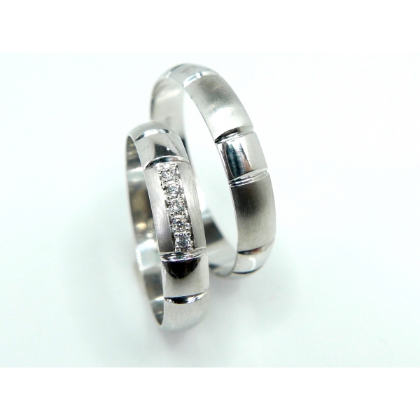 Snubní prsteny vyrobené ze stříbra zdobené matováním a dámský prsten posázený zirkony