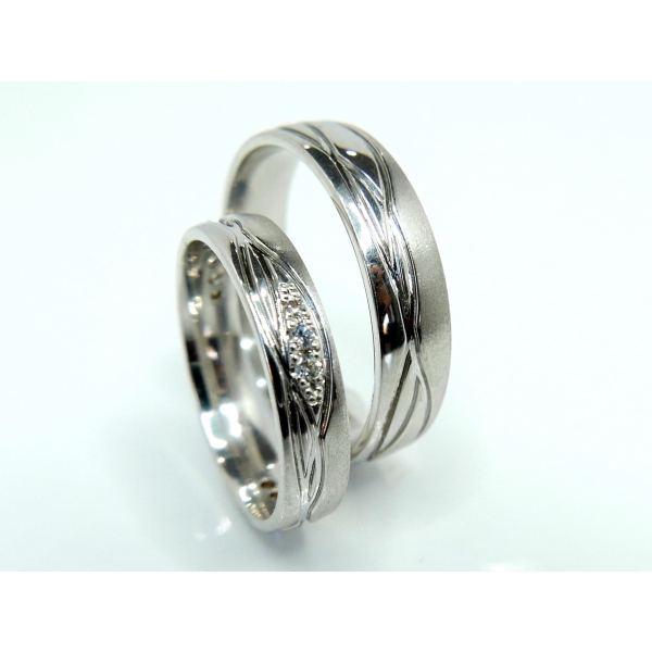 Snubní prsteny vyrobené ze stříbra. V dámském prstenu zirkony. Pánský prsten širší než dámský.