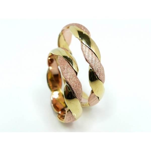 Snubní prsteny vyrobené ze zlata v kombinaci s červeným. Prsteny jsou proplétané a zdobené matováním. Možno vyrobit v různém barevném provedení